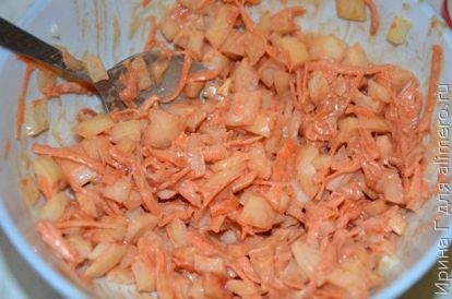 - Далее пассеруем в подсолнечном масле натертую морковь и смешиваем ее с луком.