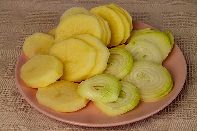 Овощи промоем, очистим от кожуры и порежем: лук кольцами, картофель кружочками. Морковь и сыр натрём на крупной тёрке.