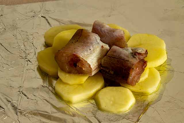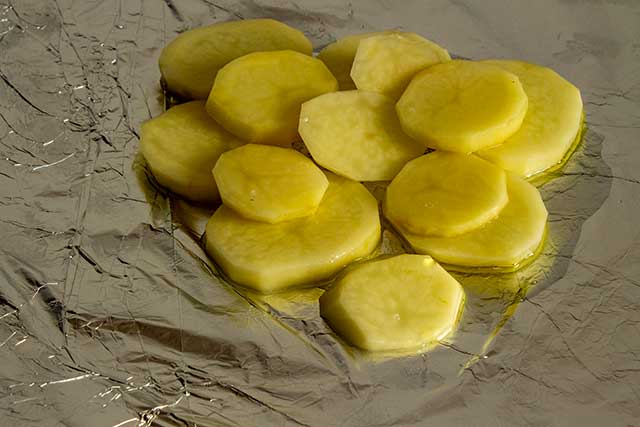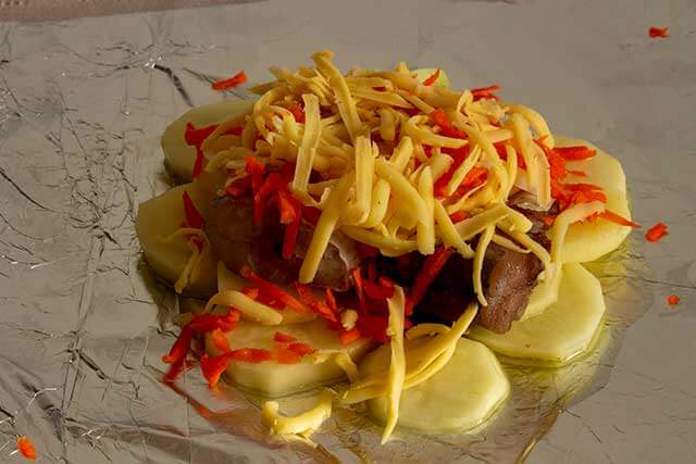 Возьмём квадратный лист фольги, смажем растительным маслом и начнем послойно выкладывать продукты. Размер квадрата фольги зависит от объема предполагаемой порции.