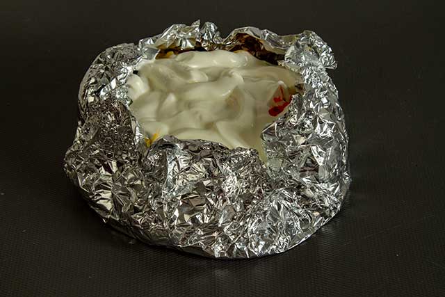Теперь упаковываем наше блюдо в фольгу. Края фольги аккуратно загибаем, делаем большие бортики и округлую форму.