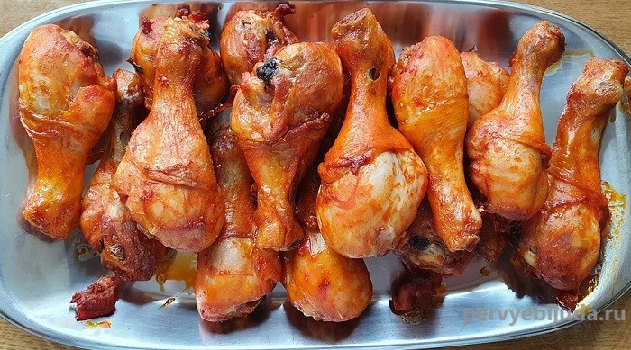 Смазать в полученном маринаде ножки, выдержать 2 часа. Готовить на огне до образования красивой румяной корочки.