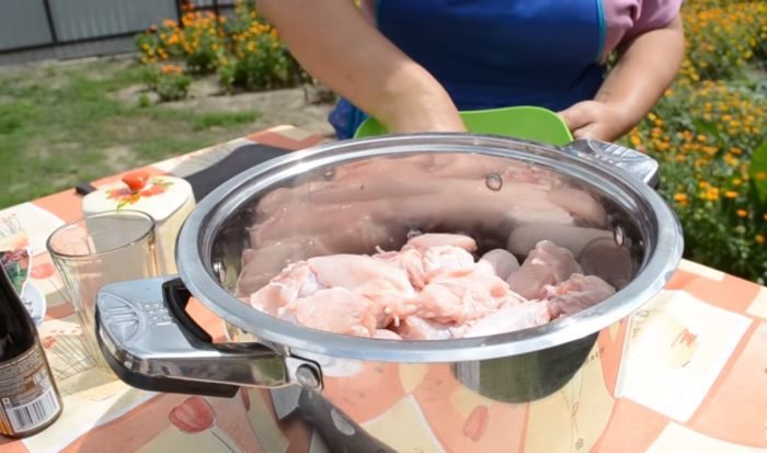 - Куриное мясо необходимо промыть, просушить и замариновать.