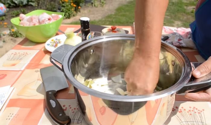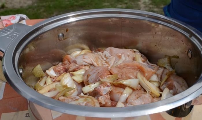 - Лук нарезать довольно крупными перышками, смешать его в миске с кусками курицы, залить маринадом и оставить на 2 часа при комнатной температуре.