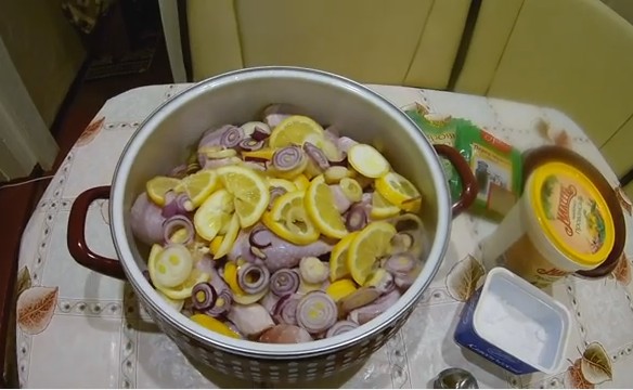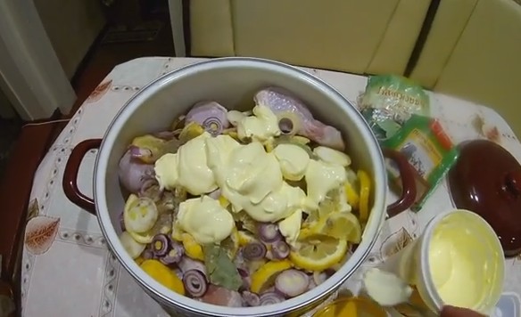 1. Поместите вымытые куриные голени или окорочка в миску, добавьте к ним резанный на кольца (или полукольца) репчатый лук и лимон. Добавьте на свой вкус соль, молотый перец и лавровый лист. Затем внесите майонез.