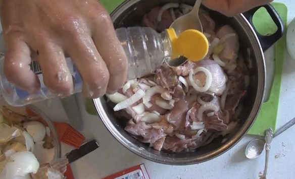 - Смешайте продукты для маринада. Имейте в виду, если кефир используется очень кислый, уксуса понадобится меньше. Ориентируйтесь на вкус. Если попробуете маринад на вкус, ничего не случится. А вы будете точно знать, вкусный он или нет.