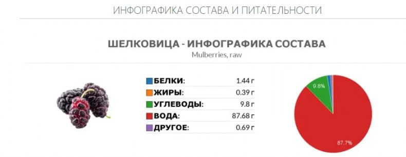 Плоды шелковицы по своему составу дарят здоровье любителям этих вкуснейших ягод. Они содержат глюкозу и фруктозу, органические кислоты. В их состав входят витамины С, Е, К, РР комплекс витаминов группы «В» и каротин. Широко представлена в ягодах «таблица Менделеева». Целый ряд макроэлементов (кальций, натрий, магний, фосфор, калий и другие) и микроэлементов (цинк, селен, медь, железо) входят в состав соплодий шелковицы. Царь-ягода отличный диетический продукт. Содержание в плодах, сильнейших природных антиоксидантов – каротина, витамина С и Е, селена, избавляют стареющий организм от множества заболеваний, обладает омолаживающим свойством.