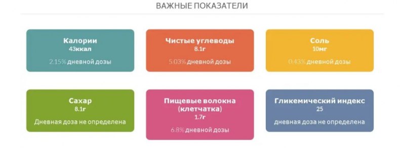Все компоненты действуют на клеточном уровне, помогая бороться не только с многими болезнями, но и лишним весом из-за малой калорийности – 50 калорий на 100 г продукта.
