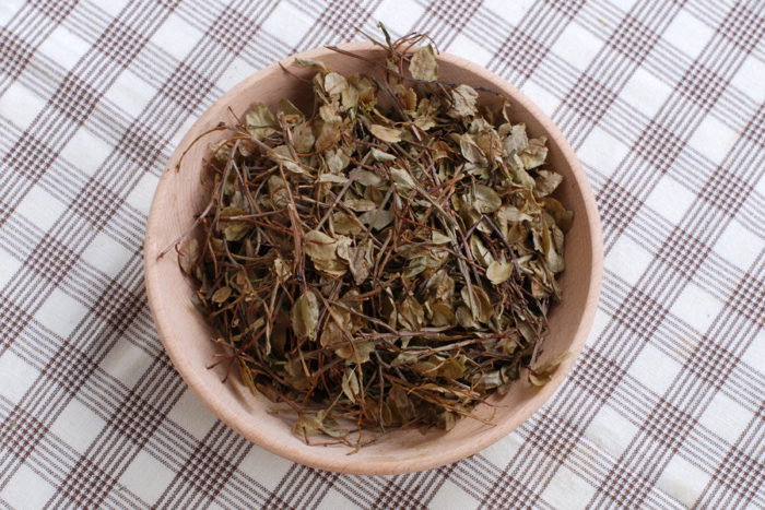 - Возьмите 60 г сухих листьев. Добавьте 1 литр кипятка.