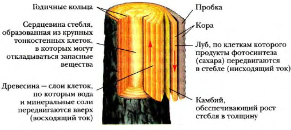 Древесина является основным компонентом стебля. Она плотная и широкая и содержит клетки различных типов и размеров. Можно выделить следующие части: сосудистая ткань, трахеиды, древесные волокна.