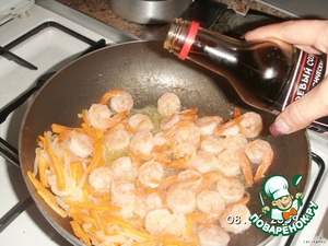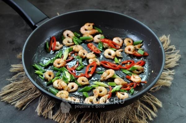 Когда все овощи достаточно обжарятся, добавьте немного креветок и прямо в
