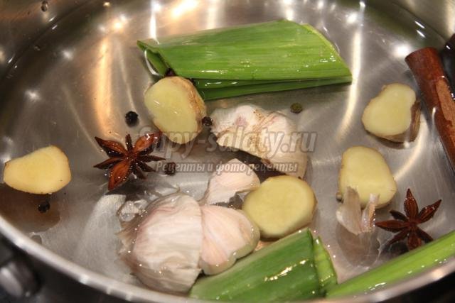 кружочками корень имбиря, крупно нарезанную зелень лука-порея. Пусть всё это