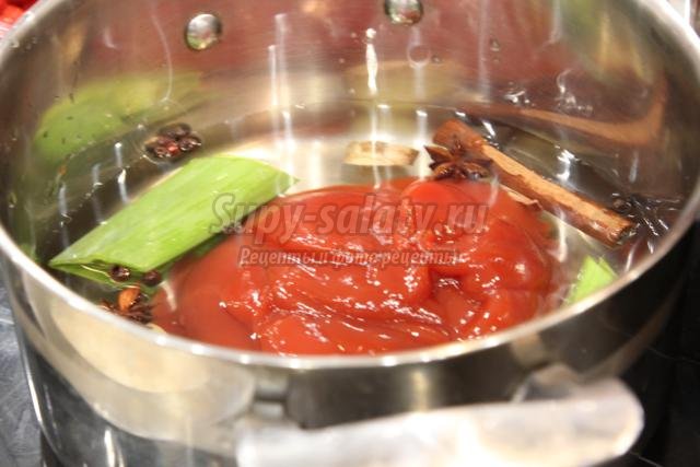 пожалуй, с соуса. В кастрюлю, где у нас уже давно томятся приправы, влейте