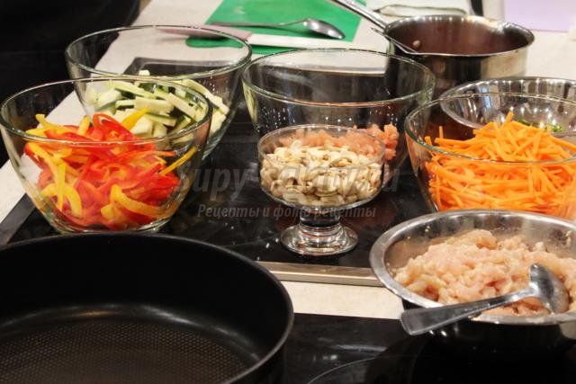 В данном случае рекомендуется использовать сковородку вок (при отсутствии таковой можно взять и стандартную). Кунжутное масло нагреть и обжарить на нем измельчённый чеснок и галангал (можно заменить имбирем). Нарезать лук и сельдерей полукольцами, а перец и морковку нашинковать соломкой. Чили превратить в тонкие колечки, а шампиньоны разрезать слайсами. Все компоненты отправить в сковородку и прожаривать в течение одной минуты на высоком огне.
