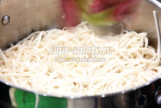 В это время у вас уже должна вариться лапша удон в чуть подсоленной воде. Варится она согласно инструкции, как правило, 4-6 минут. Слейте воду, лапшу чуть промойте под проточной водой.