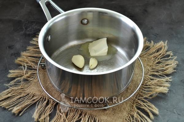 Разогрейте в сотейнике сливочное масло, добавьте раздавленный чеснок.