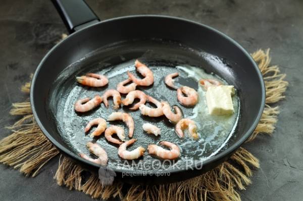 В сковороде разогрейте сливочное масло, добавьте немного растительного, обжарьте креветок около минуты.
