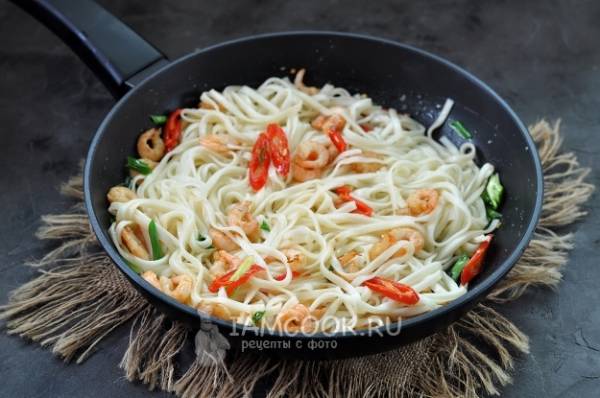 Морепродукты отварить и добавить к остальным ингредиентам, залив все соевым или тайским соусом. Последней в сковородку отправляется подготовленная азиатская лапша. Перемешать содержимое ёмкости деревянной лопаткой и томить на маленьком огне около четырёх минут, после чего переложить на тарелку и посыпать семенами кунжута.