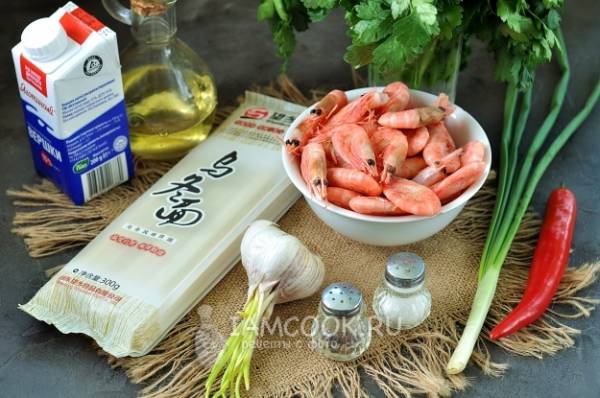 Основные продукты для приготовления лапши удон с креветками. Креветок предварительно разморозьте.