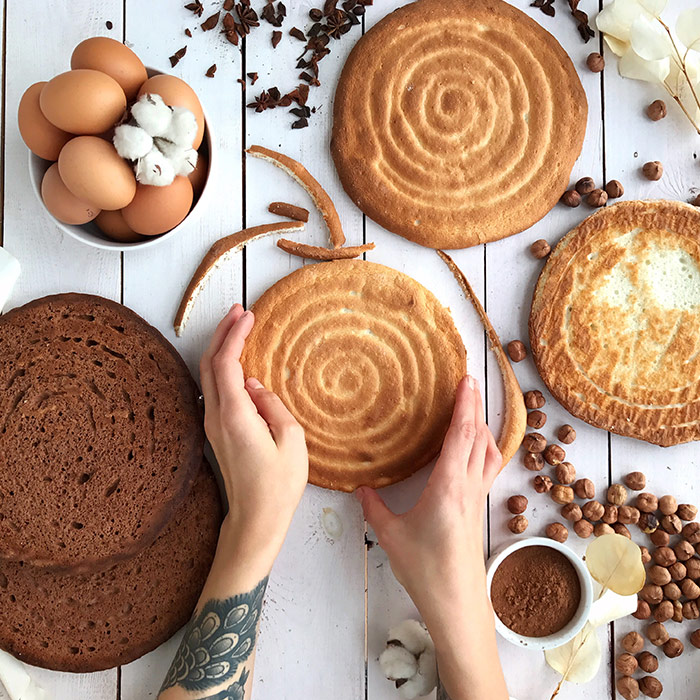 - Размороженные бисквиты намного проще выровнять. Они более стабильны. Благодаря этому готовый торт лучше держит форму.