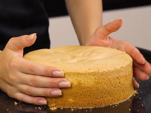Иногда верх бисквитного коржа получается неровным. В этом случае рекомендуется обрезать выпуклую часть. Ее можно измельчить и использовать в качестве декора для вашего торта.
