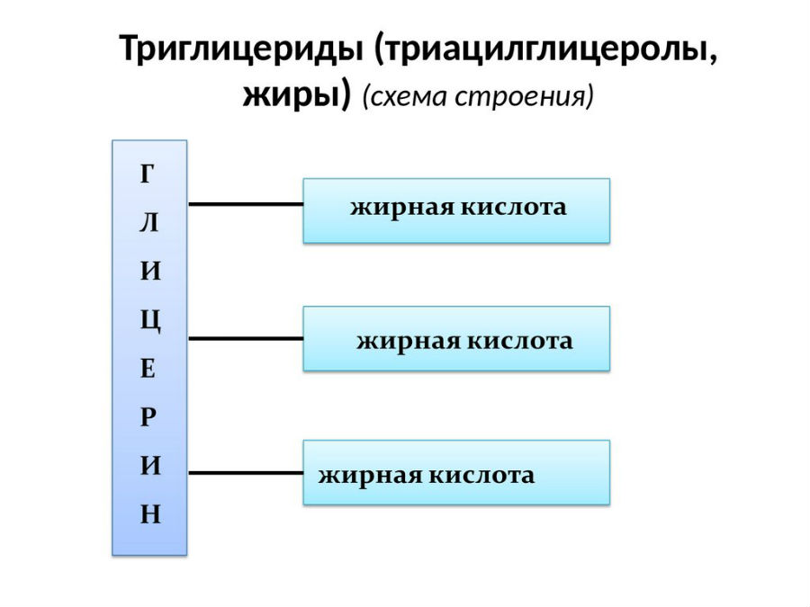 Триглецириды — это нейтральные жиры — сложные эфиры глицерина и жирных кислот. Это резервные жиры, которые являются основным источником эндогенной энергии. В жировой ткани триглицериды составляют 60-85% ее массы.
