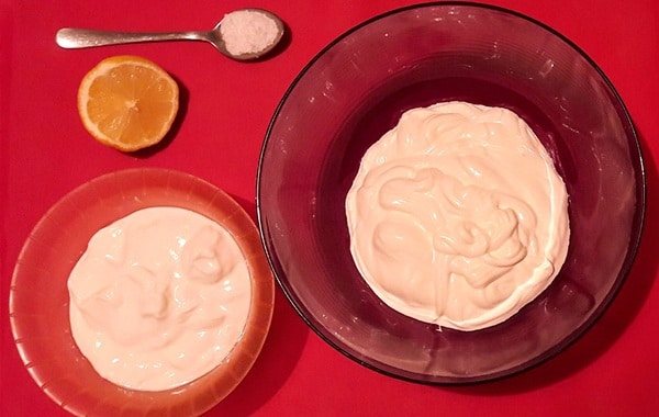 Выливаем йогурт в тарелку. Добавляем лимонный сок и хорошо перемешиваем.