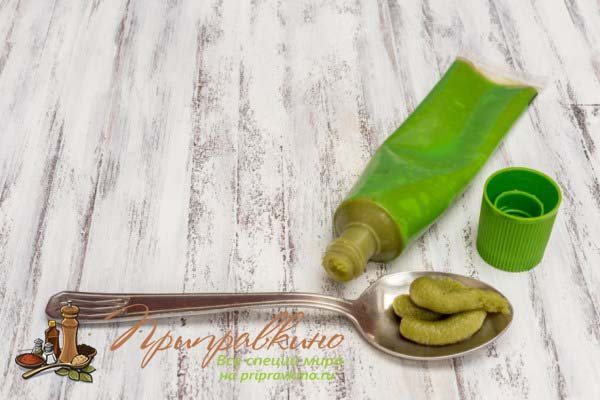 Васаби в тюбике очень легко и быстро пользоваться – просто открыть крышку и выдавить. Он удобен, если нет времени или возможности готовить приправу из порошка или свежего корня.