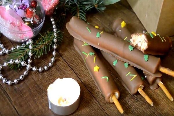 9. На водяной бане или в микроволновке растопим шоколад. Масло растапливаем отдельно. Затем соединяем эти ингредиенты для глазури в одной посуде. Переливаем в высокий стакан. Чтобы в него было удобно окунать наши палочки.