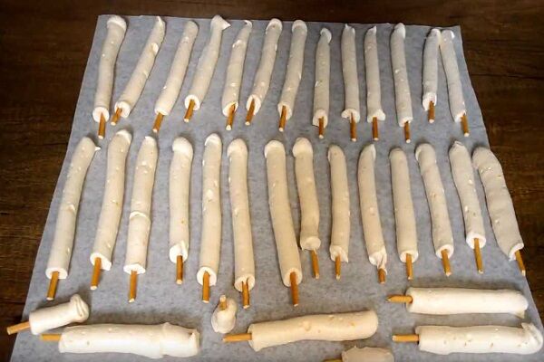 7. Немного надавливая на пакет, достаем палочку вместе с порцией зефира. Раскладываем их на поверхности, выстеленной пергаментом.
