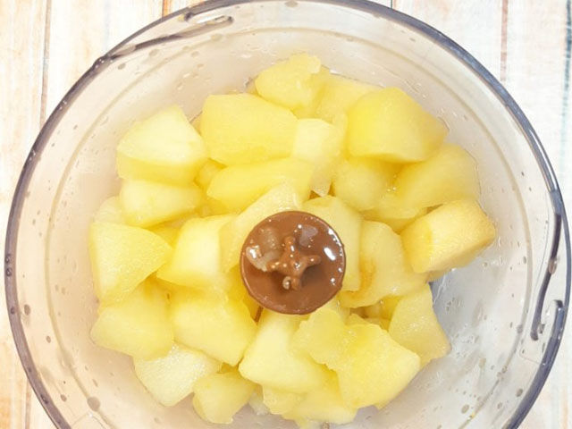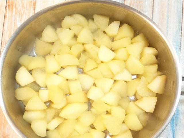 Нарезать ароматную фруктовую мякоть небольшими кубиками и высыпать в кастрюльку. Влить 3 ст. л. воды и на медленном огне пропарить под крышкой до мягкости.