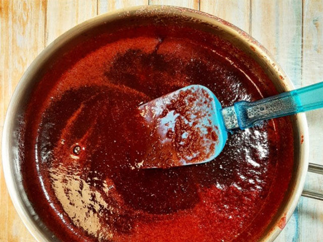 Получившуюся жидковатую консистенцию на среднем огне довести до кипения и уварить в течение 3-5 минут, чтобы выпарился избыток влаги и фруктово-ягодные кислоты потеряли своя агрессивность. Заодно это будет очень хорошей термической обработкой основы «теста». Дать остыть получившемуся однородному пюре.