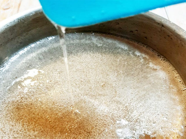 4. Необязательно иметь термометр, чтобы определить необходимую температуру. Консистенция готового сиропа густая, пузырьки начинают лопаться медленнее. Если слить его с ложки, он будет тянуться ниточкой.