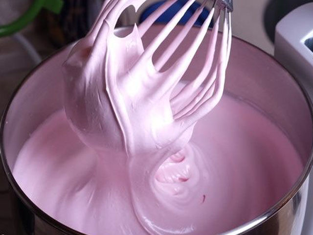 После добавления всего объема сиропа, взбиваем состав и далее, до получения массы, схожей с безе.