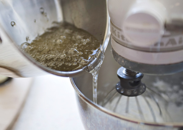 Не выключая миксер, вливаем тонкой струйкой еще горячий сироп и продолжаем взбивать, пока масса не станет однородной и густой.