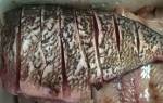 - сделать два глубоких надреза вдоль всего позвоночника, вырезав длинный плавник и разрезав мясо до самого хребта;