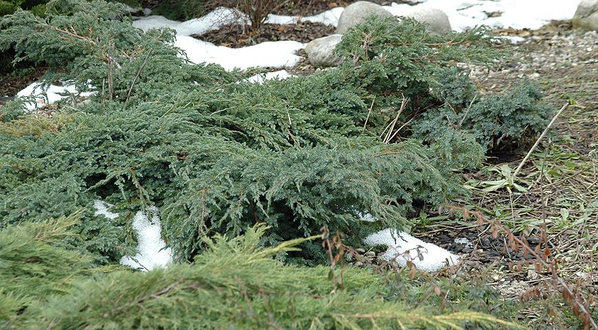 Молодым посадкам можжевельников необходимо рыхление – неглубокое, после полива и прополки сорняков. Сразу после посадки почву мульчируют торфом, щепой, сосновой корой или скорлупой кедровых орехов, толщина слоя мульчи 5–8 см. Теплолюбивые культивары мульчируют на зиму, а ранней весной мульчу обязательно отгребают, так как она может вызвать загнивание корневой шейки.