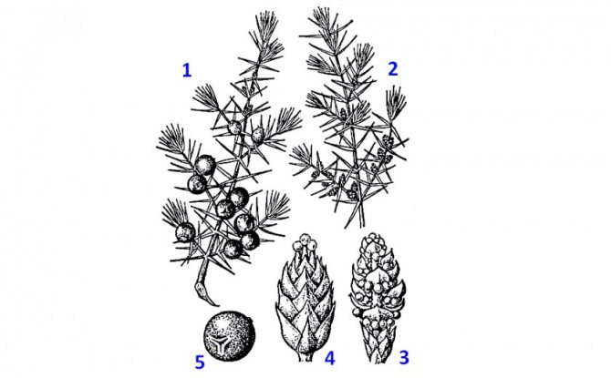 1 — веточка с женскими шишками; 2 — веточка с мужскими шишками; 3 — мужская шишка; 4 — молодая женская шишка; 5 — зрелая шишка («ягода»).