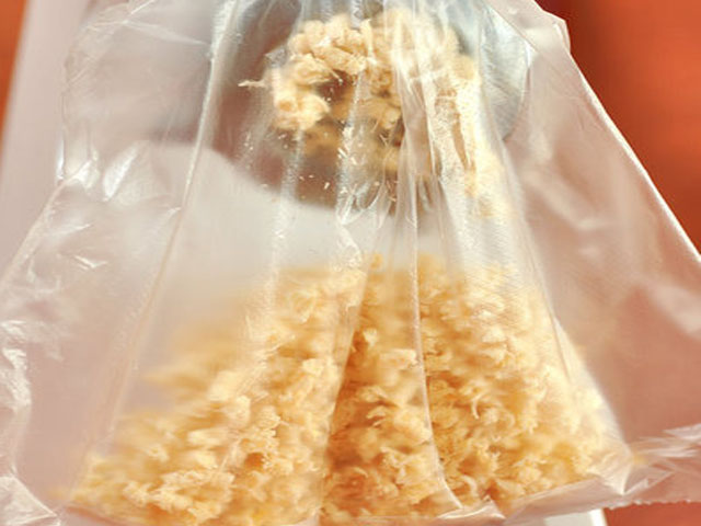 Теперь нужно перекрутить корень через мясорубку. Чтобы защитить свои глаза, на фильере закрепляем пакетики. Закрываем упаковку и на время убираем.