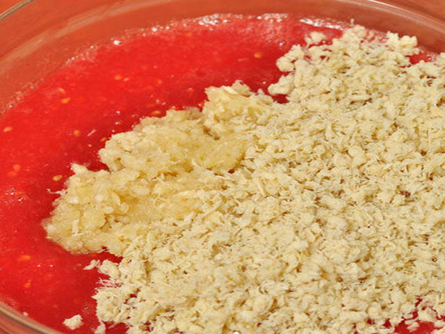 В сок добавляем все указанные ингредиенты и смешиваем его с измельченным корнем хрена.