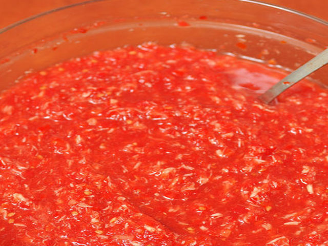 Вымытые помидоры перекручиваем через мясорубку. Очищенные корни хрена, чеснок и острый перец без семян пропускаем в полиэтиленовый пакет. Соединяем составляющие в эмалированном ведре, солим и тщательно перемешиваем. Следим за тем, чтобы до края емкости оставалось не менее 5-7 см. Иначе при брожении продукт может вытечь. Накрываем ведро крышкой и оставляем на 5 дней при комнатной температуре. Периодически размешиваем содержимое, чтобы протертая масса, всплывшая на поверхность, взаимодействовала с закисшим соком. Переливаем в сухие банки, храним в темном прохладном месте.