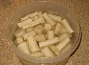 Если не покупаете корень, а имеете его в своем саду и он не лежал перед готовкой. В этом случае мы его не будем замачивать в воде. В любом другом случае, его надо помыть и замочить в ледяной воде на 1ч. и более (можно на всю ночь).