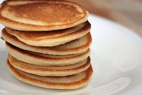 Два куриных яйца взбить с помощью миксера или венчика с 30 г сахара и щепоткой соли, в получившуюся смесь влить 500 мл теплого молока и перемешать, постепенно всыпая 300 г муки. Дать тесту немного постоять, примерно 15-20 минут. Затем необходимо ввести 1/3 чайной ложки пищевой соды, погашенной уксусом. После этого блинчики жарят на хорошо прогретой и прокаленной сковороде на среднем огне. Уже готовые блины лучше смазывать сливочным маслом.
